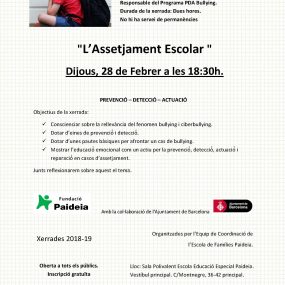 Dijous 28 de Febrer a les 18:30h, et convidem a venir a la xerrada sobre l’ Assetjament Escolar que farem a l’Escola d’ Educació Especial Paideia. Aquesta xerrada és gratuïta i està oberta a tots els públics. Inscripcions a través
