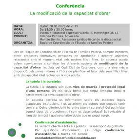 Dijous 28 de Març a les 18:30h, et convidem a venir a la xerrada sobre la Modificació en la Capacitat d’Obrar que farem a l’Escola d’ Educació Especial Paideia. Aquesta xerrada és gratuïta i està oberta a tots els públics.