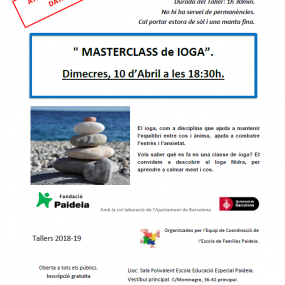Dimecres 10 d’abril, de 18:30 a 20h, a l’Escola d’Educació Especial Paideia. Vols saber què es fa en una classe de ioga? Et convidem a descobrir el Ioga Nidra, per aprendre a calmar ment i cos. Entra a la notícia