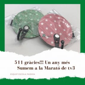 Moltíssimes gràcies @escolapaideia!! Gràcies a la col·laboració de les famílies de l’escola, amb la compra dels penja mascaretes, s’han aconseguit 511,00€ per la Marató d’aquest any dedicada a la investigació de la COVID-19.