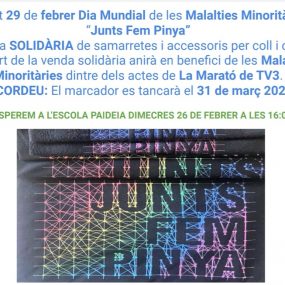 I seguint amb el nostre compromís solidari, aquest dimecres 26 de febrer a les 16h, paradeta solidària a la porta de l’Escola Paideia!! Samarretes i accessoris sota el lema Junts Fem Pinya, per seguir col·laborant amb la recerca dins del